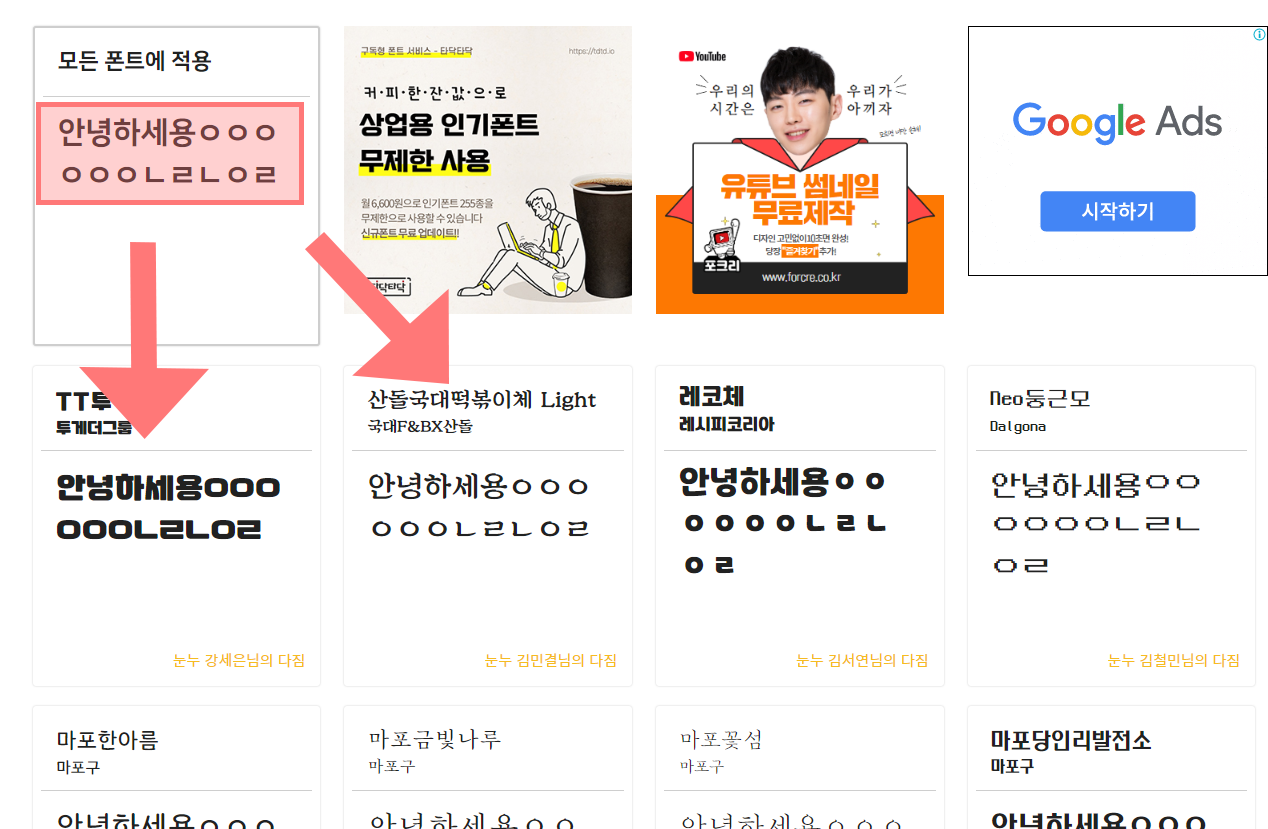 ▼ 스크롤을 내려서 홈페이지를 둘러보시면 많은 다양한 폰트들이 있습니다. 마음에 드시는 폰트를 클릭해주세요.