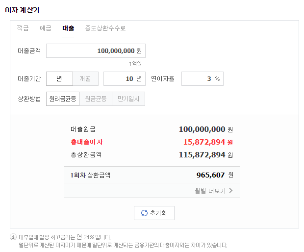 저는 이런 식으로 대출금액 100,000,000원(1억 원) / 대출기간 10년 / 연이자율 3% / 원리금 균등 방법으로 계산을 해보겠습니다.